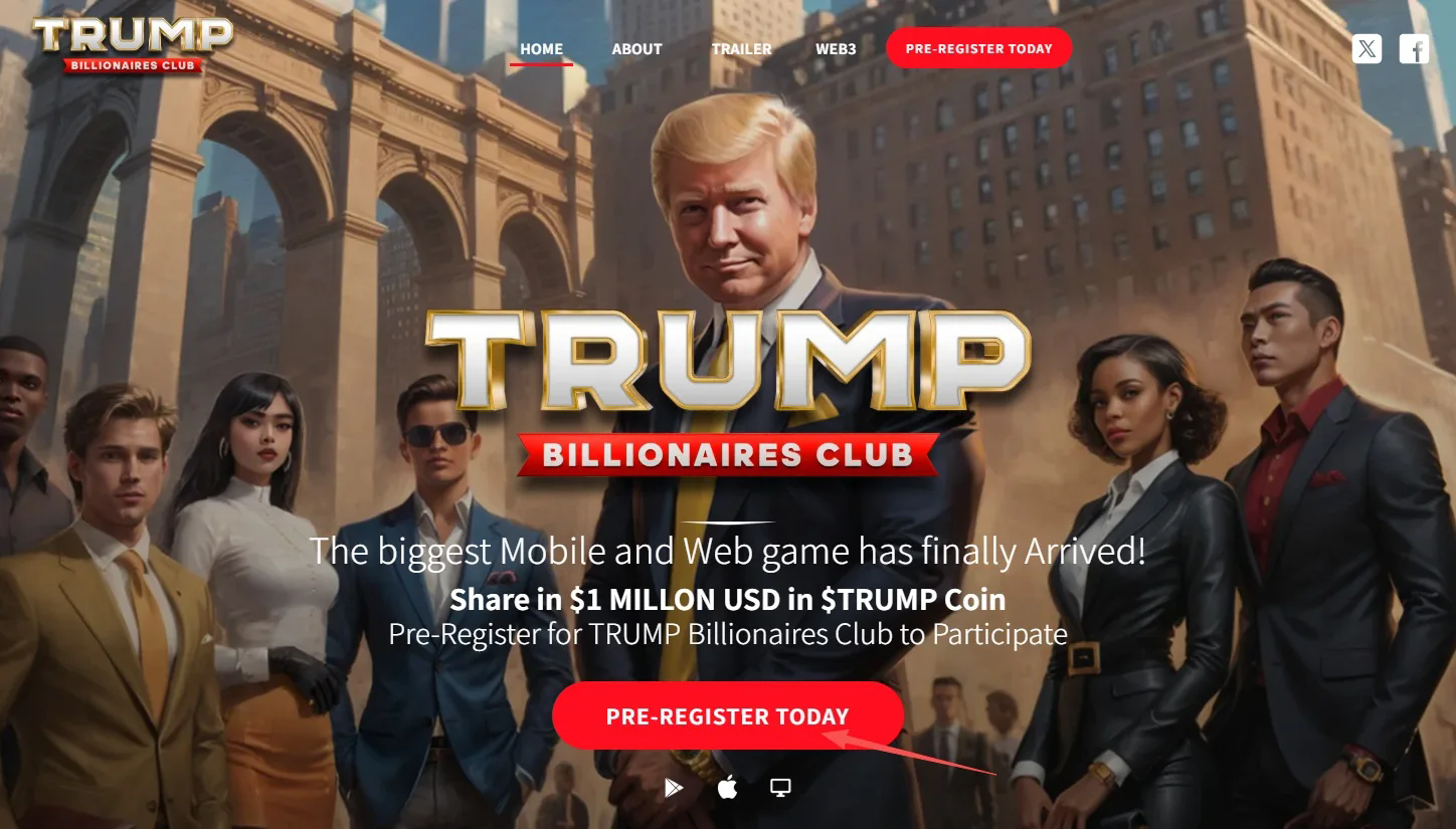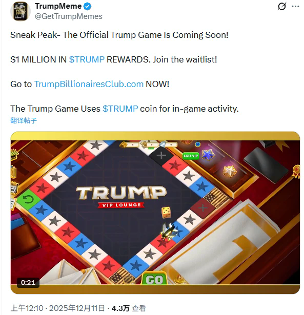 12月11日,TRUMP Meme代币团队在X平台发文表示,将推出一款面向特朗普粉丝的手机游戏Trump Billionaires Club,目前已上线预告页面并开放候补名单。项目方表示,游戏将设置TRUMP代币相关奖励机制,参与用户或可获得价值约100万美元的奖励。