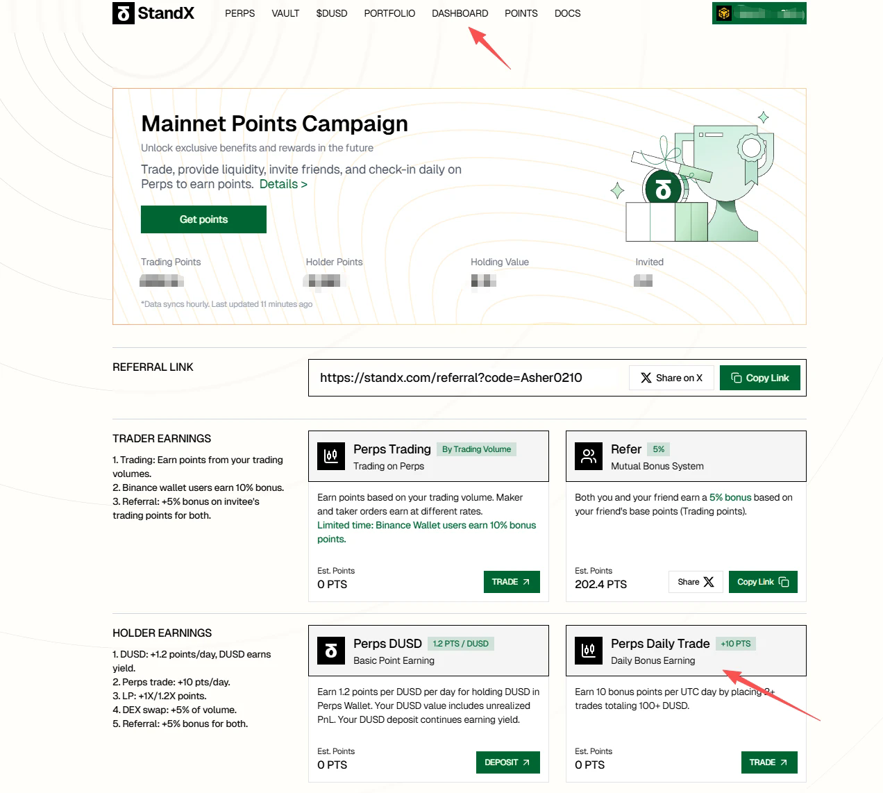 STEP 3.点击上方“DASHBOARD”可查看个人交易积分。此外,每日交易任务获积分值得参与。