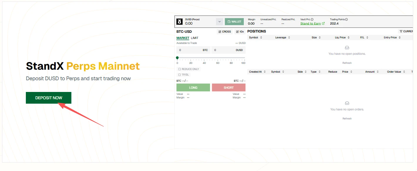 STEP 1.进入交互网站(链接:https://standx.com/),连接Web3钱包后点击上方“PERPS”,进行链上合约交易界面。