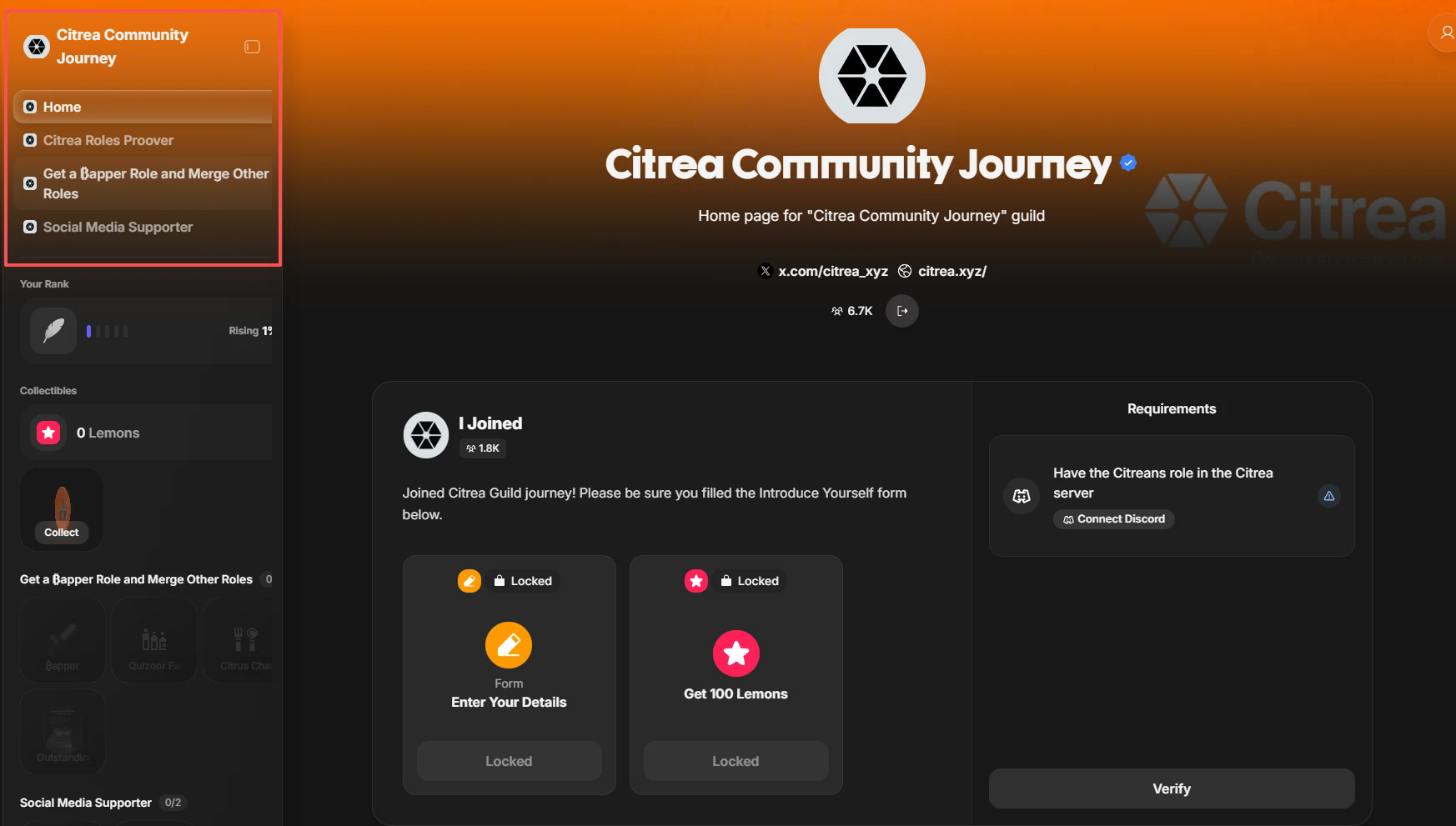 进入交互网站(链接:https://guild.xyz/citrea-community-journey/)并登录个人账号,完成任务需满足的条件包括Discord指定身份、测试网用户、NFT持有者。