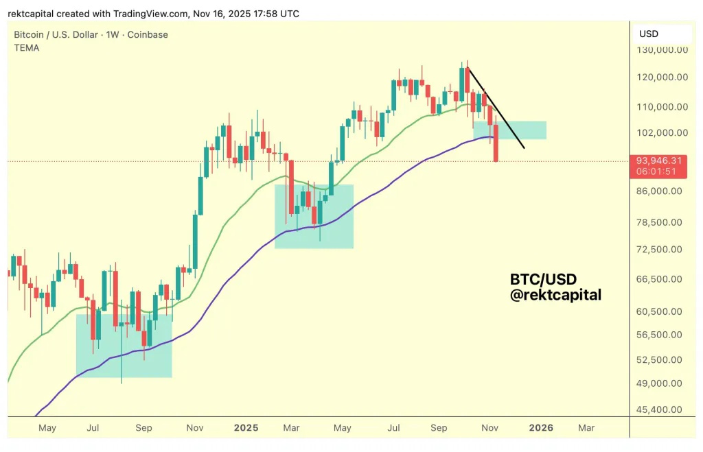 然而,从周线图来看,市场分析师Rekt Capital对最近的下跌并不看好。他认为,50周指数移动平均线一直是本轮周期的核心“牛市结构”。他写道:“当支撑持续上涨势头的牛市结构开始失效时,熊市便会到来。”