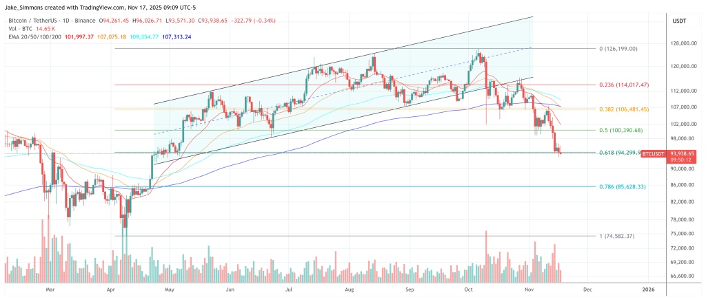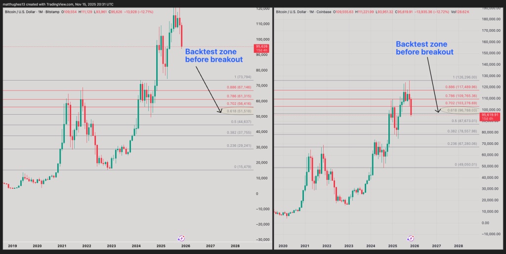 他利用从2024年3月高点到2022年11月低点的月度斐波那契回撤位,指出比特币此前触及了51,518美元的0.618回撤位,“甚至一度跌破该位,随后反弹”。根据从2025年10月高点到2024年8月低点绘制的新一组斐波那契回撤位,同一关键水平位目前位于96,975美元。目前价格略低于该水平,与2024年的影线走势类似。
