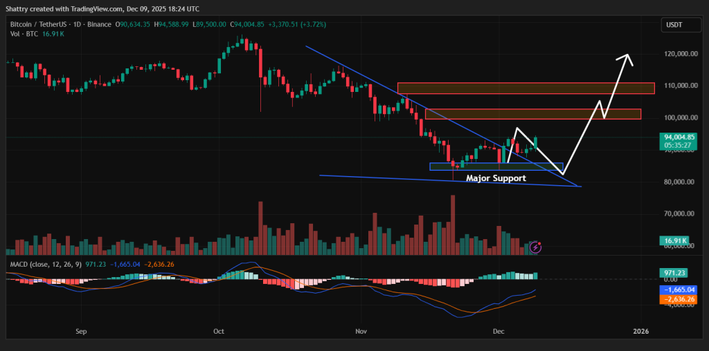 日线图显示,比特币在十一月大部分时间处于受控下跌后,正试图摆脱多週下降趋势线。价格现在正推升穿越对角阻力位,伴随着明显增加的成交量,显示买家正重新进入市场。