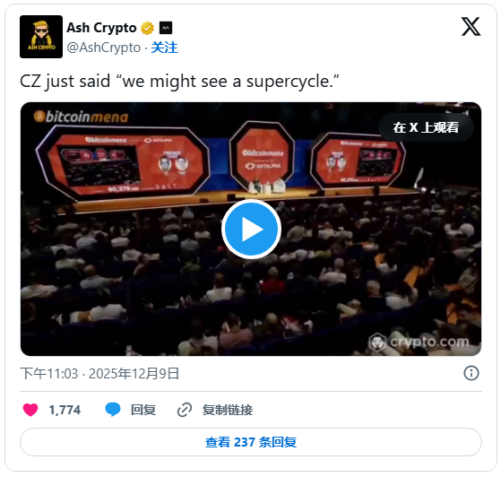 在阿布达比正在举行的比特币MENA大会上,币安创办人赵长鹏(CZ)表示,加密货币「超级周期」可能在2026年出现。