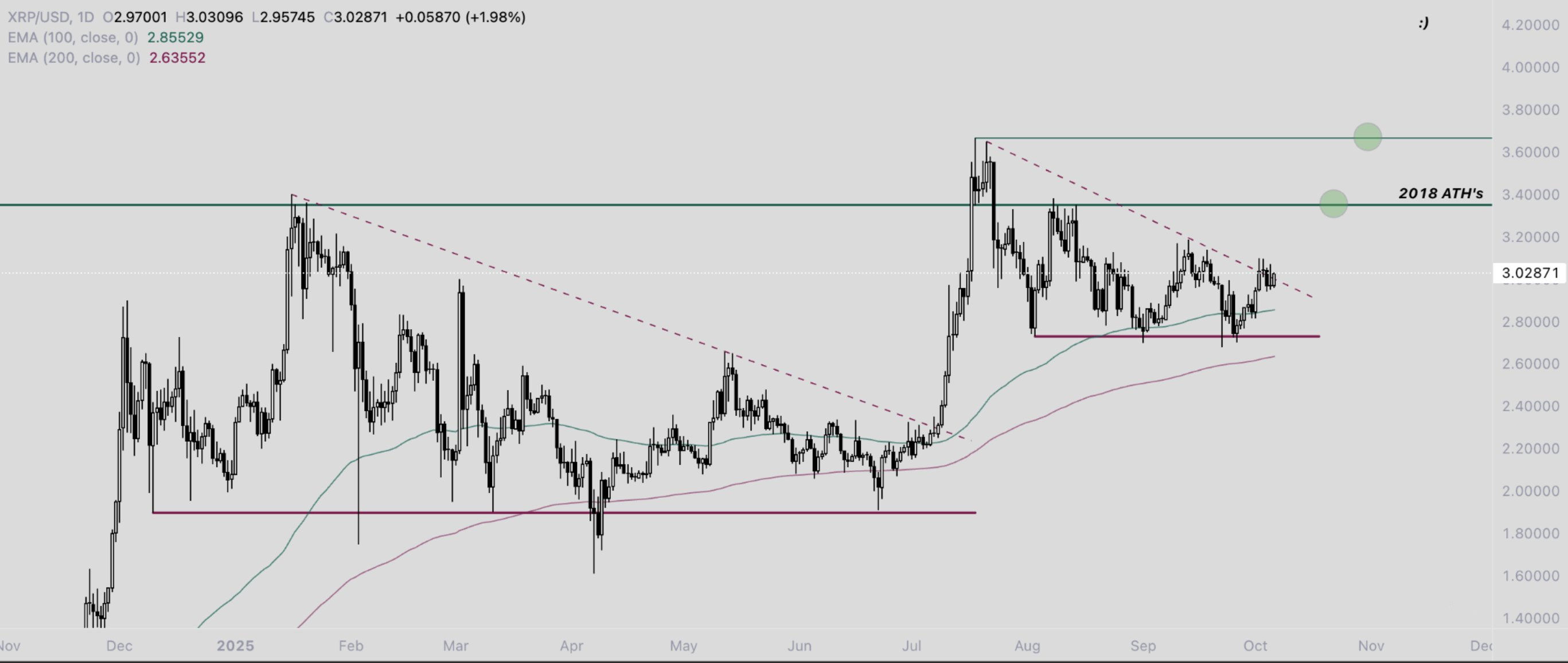 尽管短期内出现盘整,XRP 的价格结构仍保持历史强势。该资产目前维持着自 2017 年突破高点以来的最高周度和月度收盘价区间。