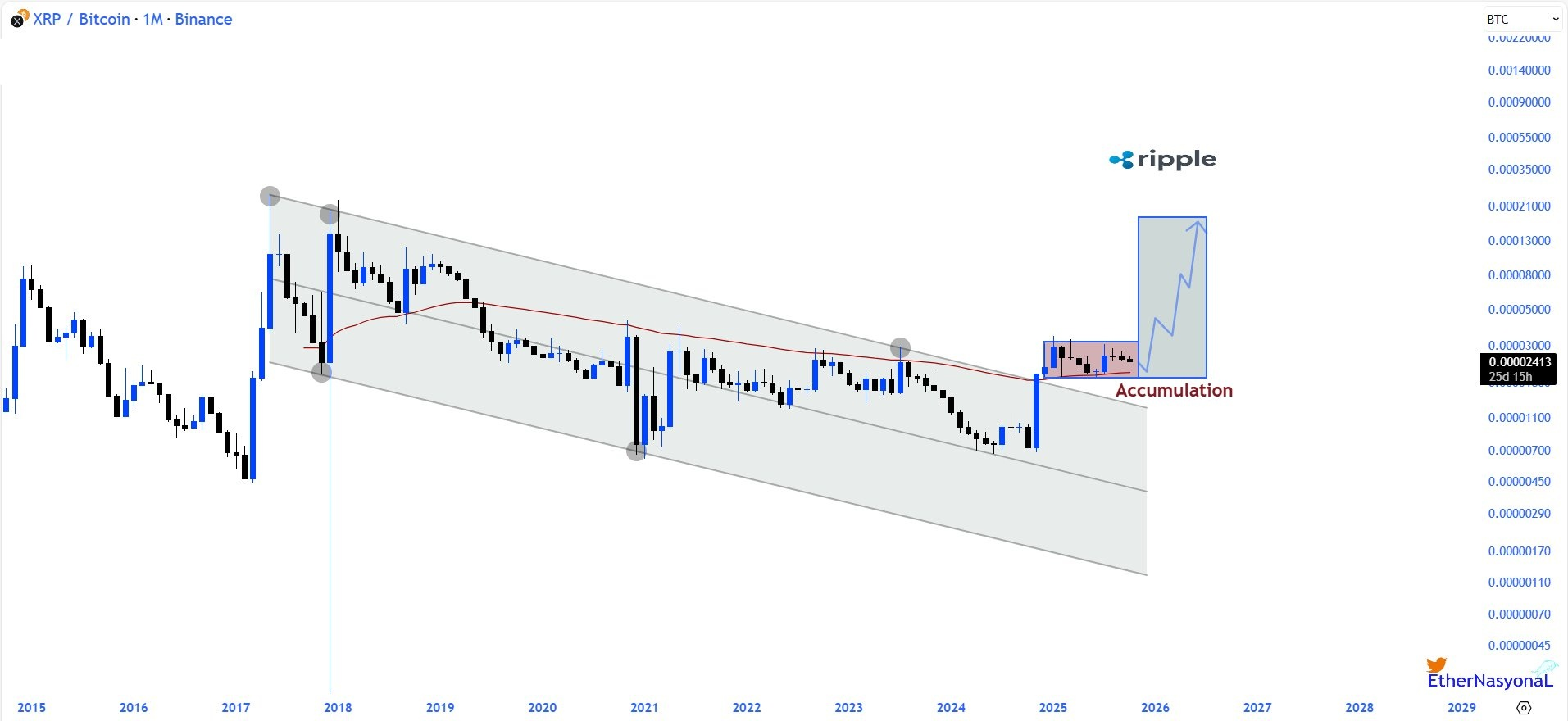 与此同时,加密货币分析师 EtherNasyonal 表示 ,XRP 相对于比特币的七年半下降通道在 2024 年底被打破,标志着一个重大的结构性转变,并且在过去一年中持续积累。