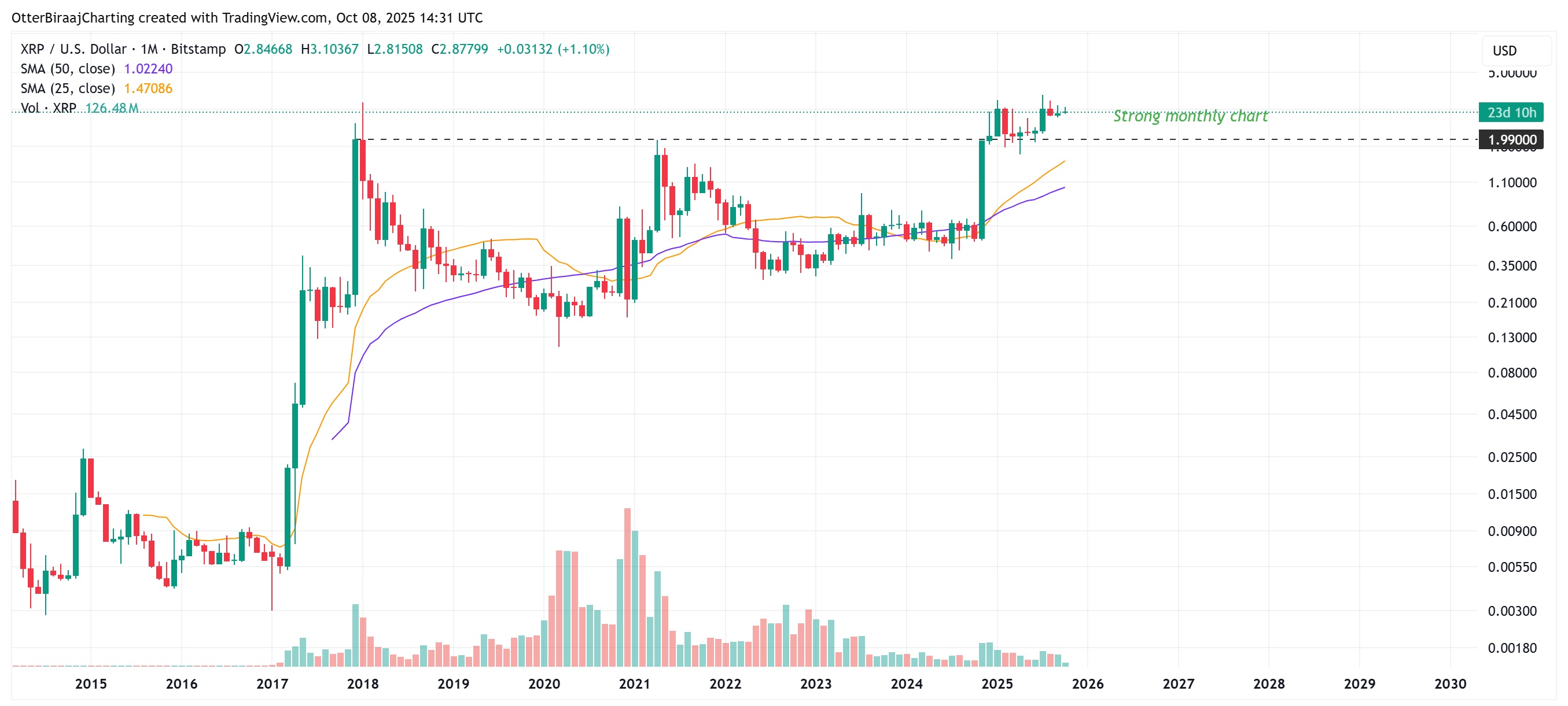 ● 月度图表显示看涨结构,突破 3.30 美元可能引发 60% 至 85% 的上涨空间。