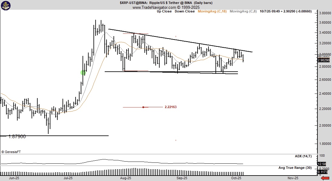 然而,交易员 Peter Brandt 指出 ,XRP 的日收盘价跌破 2.65 美元可能是一个决定性点位。这将确认下降三角形形态。Brandt 表示,