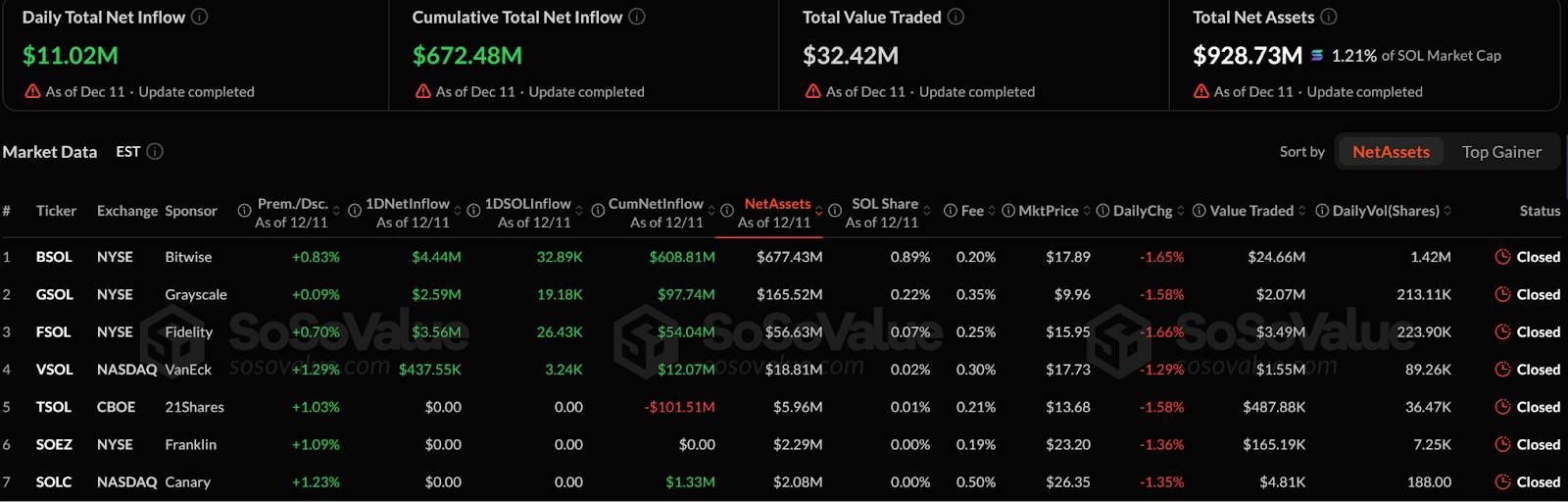 SolanaETF的推出由多家资管机构联合推动,Solana ETF自上市以来累计净流入约6.72亿美元,而总AUM大约9.28亿美元。这意味着Solana ETF的“规模体量”在山寨币产品中属最大级别,也是资金吸纳持续性较好的代表。