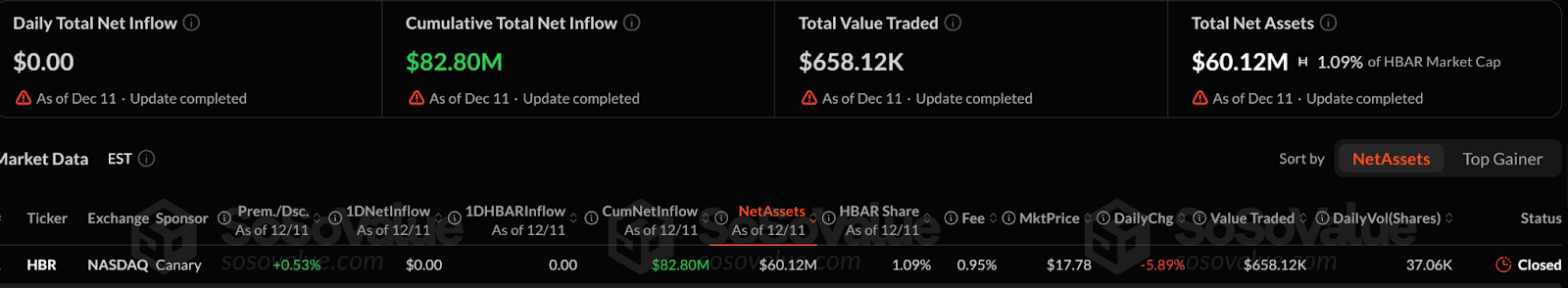 Hedera(HBAR)的ETF也已进入交易市场,并获得一定关注。诞生较早的Hedera ETF收拢了约$82M美元左右的净资金流入,成为中等规模的山寨币产品。相比XRP和SOL,HBAR的资金量相对较少。