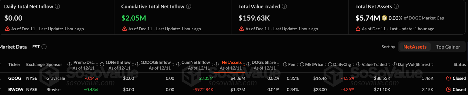 根据最新SoSoValue数据,截至目前DOGE现货ETF的历史累计净流入约2.05百万美元,这显示资金配置极为有限。交易活跃度层面,DOGE ETF的成交额总体也较冷。尽管首日成交额曾出现几百万美元的交易,但总体成交结构并不均衡、常常伴随资金进出稀疏的情形。这样的成交表现表明机构资金不愿意在DOGE ETF中深度配置。