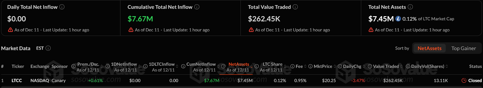根据SoSoValue数据,截至2025年11月中旬,LTC ETF(通常简称为LTCC)累计净流入资金约7.67百万美元。甚至有多日资金净流入为零的情况出现。相比XRP ETF的数亿美元级别流入和SOL ETF的数千万到上亿美元级规模,LTC的资金吸纳明显不足,并未成为投资者构建山寨币ETF配置体系中的核心标的。