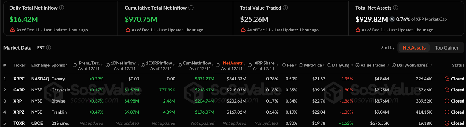XRP ETF在上市之后表现出较强的资金吸引力,自上市以来累计净流入约9.7亿美元,所有XRP基金合计管理资产超过9.29亿美元,自11月13日上线以来连续多个交易日录得资金净流入,近11个交易日累计流入约$756百万美元。