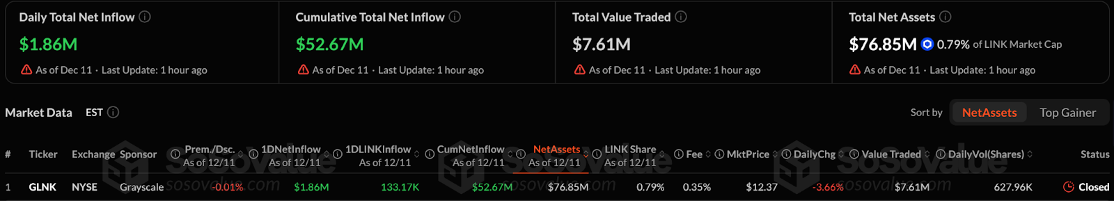 美国首只支持LINK(Chainlink)的现货ETF,灰度Chainlink信托基金(Grayscale Chainlink Trust ETF,代码GLNK)已于美东时间2024年12月2日在纽约证券交易所(NYSE)正式上市。LINK ETF自上线以来已有约$52M资金净流入,AUM为$76M。资金吸引力部分来源于Chainlink在区块链数据基础设施领域的实际用途,使得部分长期机构投资者对其ETF给予了战略性配置。