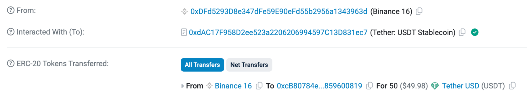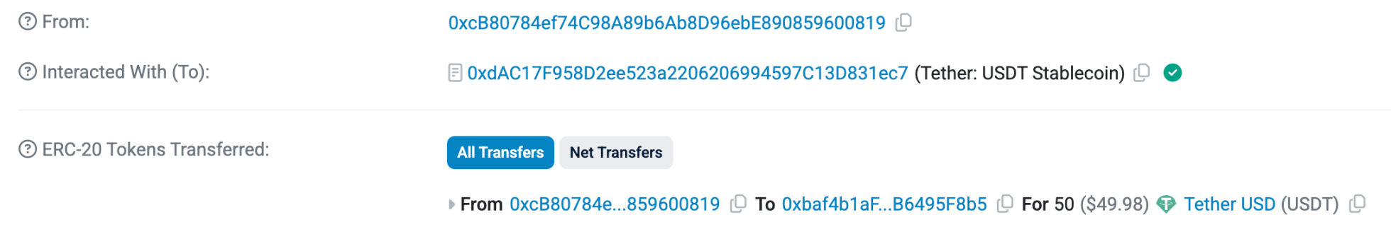 大约20分钟之后,收到5000万枚USDT的地址就先向0xbaf4…95F8b5转入50枚USDT用于测试。