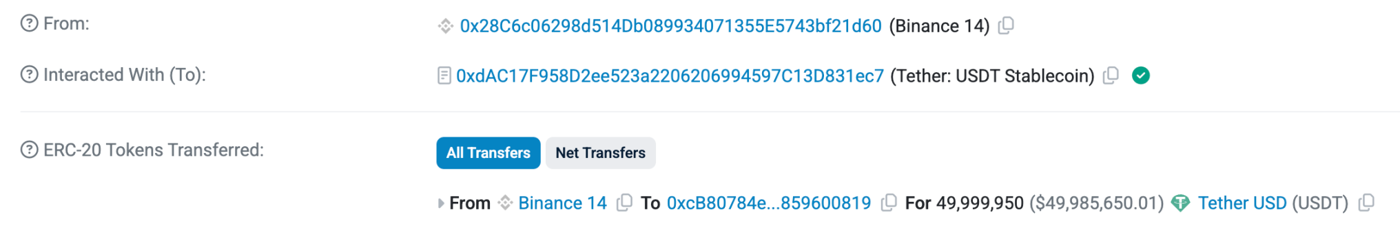 大约10小时之后,该地址从币安一次性提出了49,999,950枚USDT,加上之前提出的50 USDT,总计正好5000万。