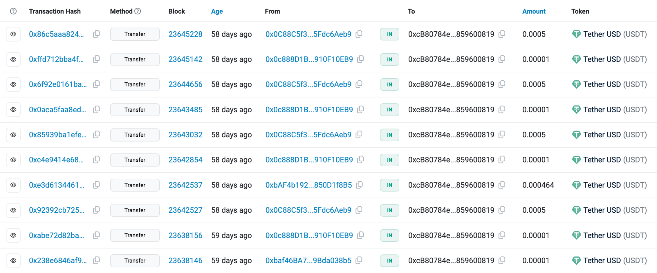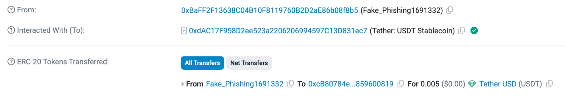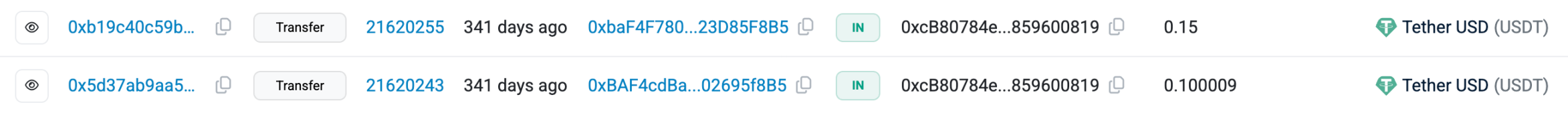 就在测试转账完成后的不到15分钟时间,黑客地址0xbaff…08f8b5,就向剩下49,999,950枚USDT的地址转入0.005枚USDT。黑客使用的地址与接收50枚USDT的地址开头结尾都很相似,是一次明显的「地址投毒」攻击。