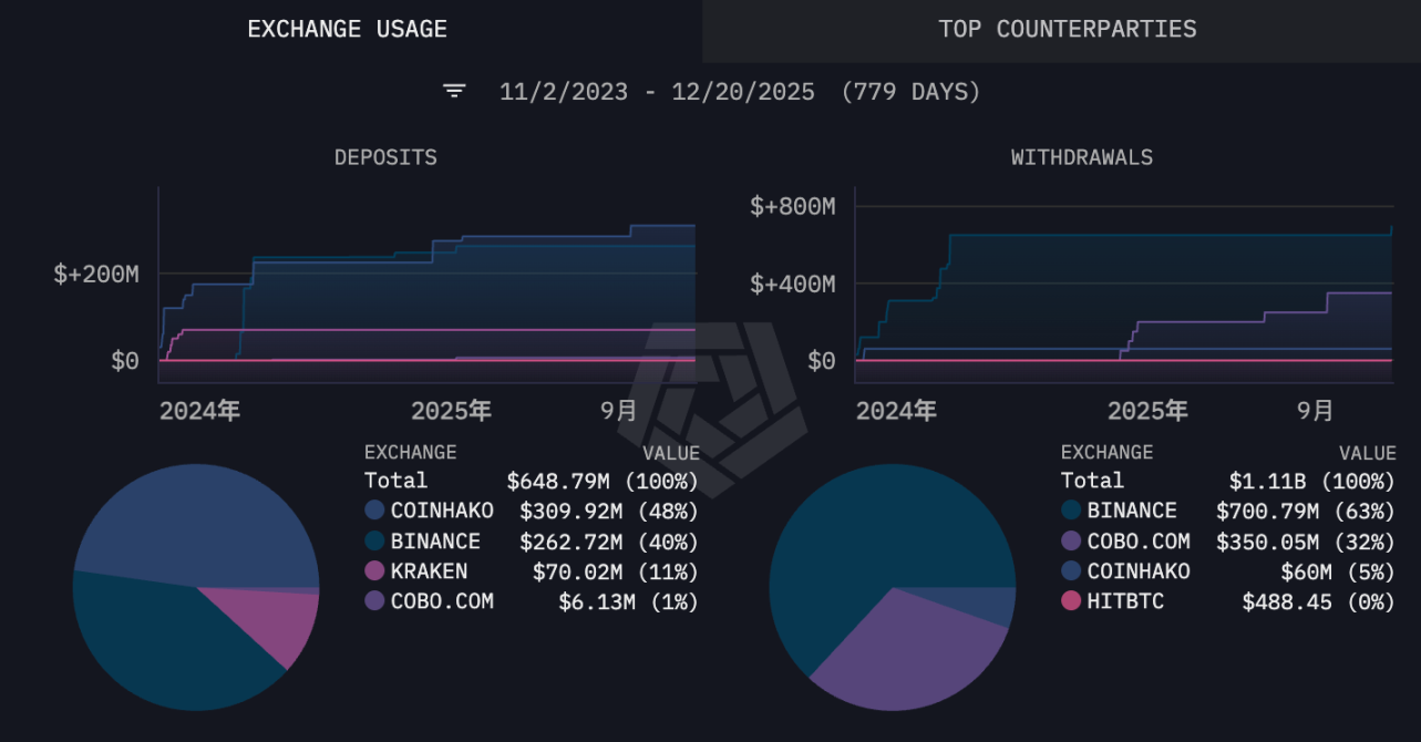据Arkham平台整理的数据,该地址与币安、Kraken、Coinhako、Cobo地址均有大额转账记录。币安、Kraken和Cobo无需介绍,而Coinhako可能是一个相对陌生的名字。Coinhako是一家成立于2014年的新加坡本地加密货币交易所,于2022年获得新加坡金融管理局颁发的大型支付机构牌照,属于新加坡受监管的交易所。