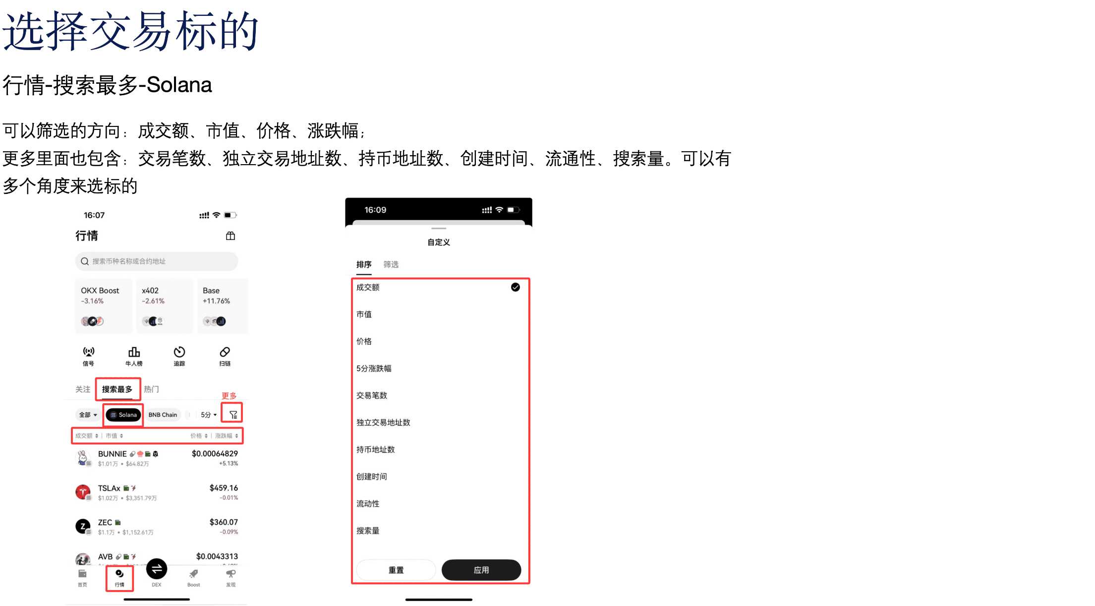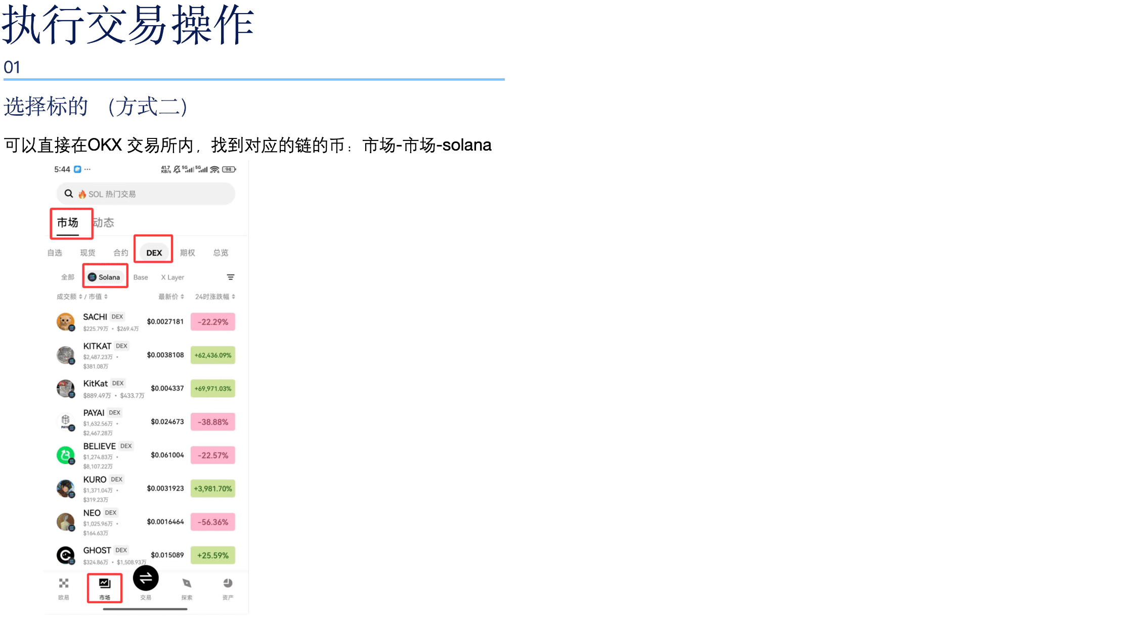 找交易标的有两种方式,第一种是在行情页面里筛选 SOLANA 链,从里面找到你想买的币,这里一定要注意,因为你充值的是 SOL 链的 USDT 和 SOL,所以只能买 SOL 链上的 MEME 币,千万别充错链导致资产无法使用;