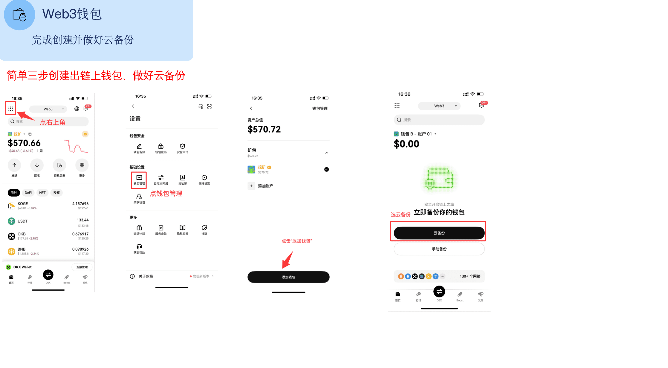 这个钱包对应的地址很关键,以后你可以通过它把链上资产转到世界任何一个角落,也能从别处收到资金,更能直接用它做 DEX 交易,不过有个重要提醒:创建完一定要备份!考虑到大家都是新手,建议先选云备份,等熟悉之后再考虑云备份和手动备份结合,这样能给资产多一层保障。
