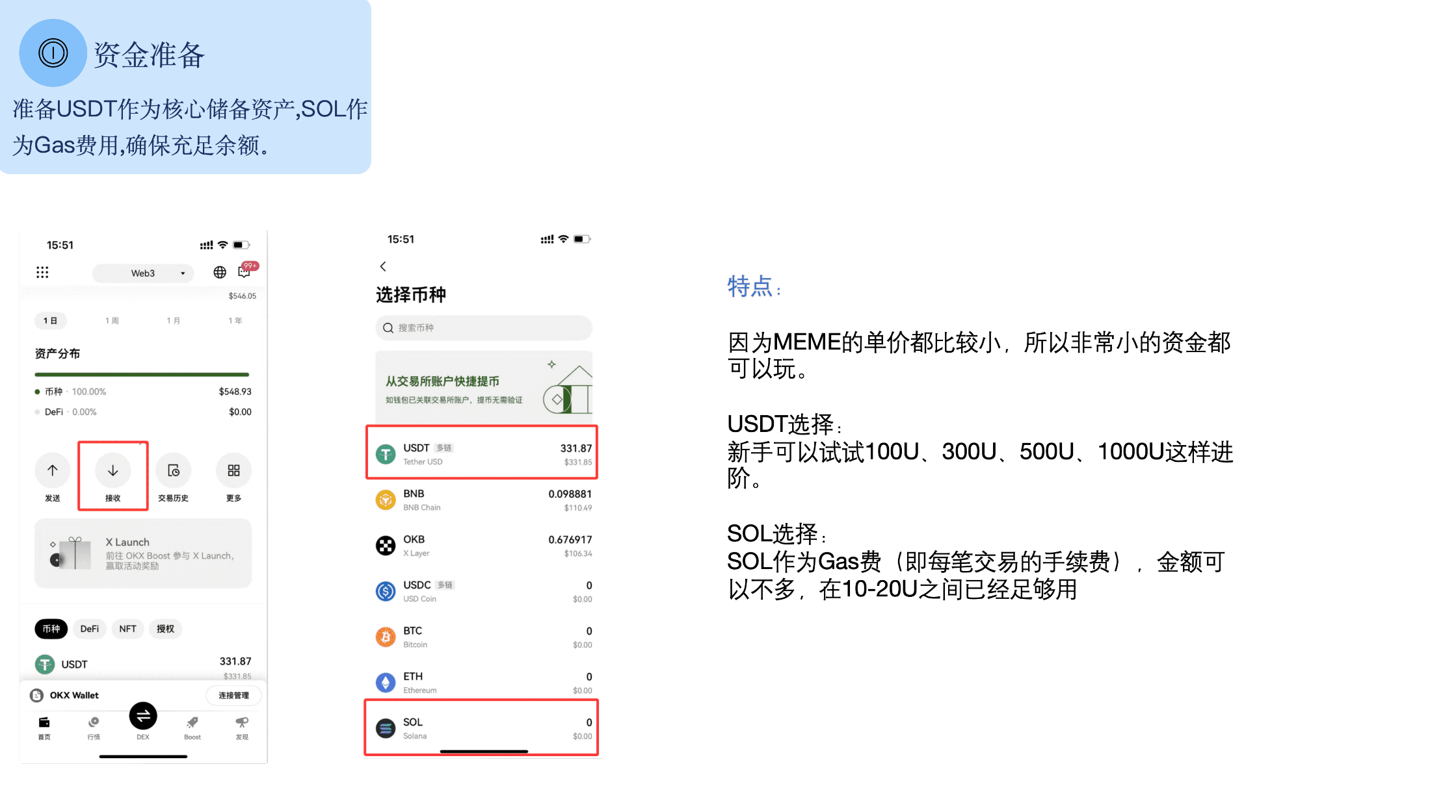 另外,因为大家充值的是 SOL 链的资产,所以初期建议先玩 SOL 链的 MEME 币,这类币种里有不少 “小投入能搏机会” 的选择,而且操作起来和自己的资产链匹配,不容易出跨链问题。还有个点要解释下,之前让大家准备 10-20U 的 SOL,其实就是为了支付交易时的 Gas 费,你可以把它理解成日常转账的手续费,这也是大家平时看新闻或快讯时会提到的概念。