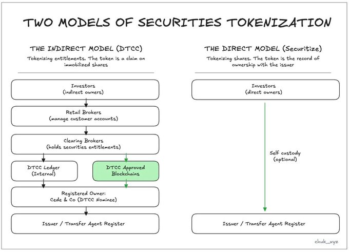DTCC代币化的是「权利主张」,而直接模式代币化的是「股票本身」。两者都被称为「代币化」,但解决的是完全不同的问题。