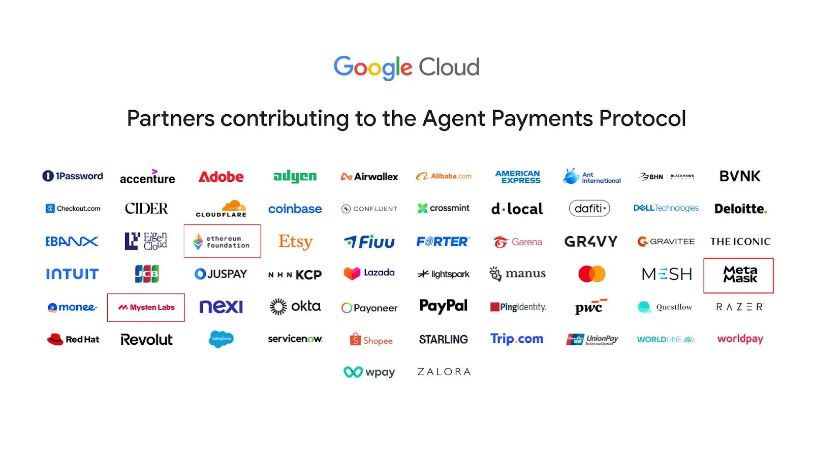 前不久,Google推出Agent Payments Protocol(AP2)协议,Ethereum Foundation、Mysten Labs、MetaMask等加密巨头赫然在列。