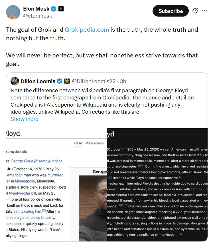 该用户注意到,Grokipedia 文章的第一段强调了弗洛伊德的长期犯罪记录,而维基百科文章则强调他是被一名“白人”警察杀害的。