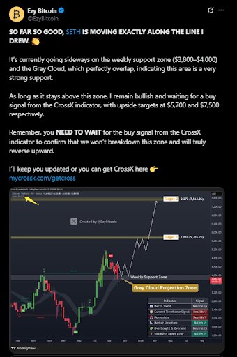 分析师称后续方向取决于能否突破4,500美元的多月阻力。明确突破或触发向EzyBitcoin指出的5,700美元区域进发,而持续跌破4,000美元将破坏该预期。