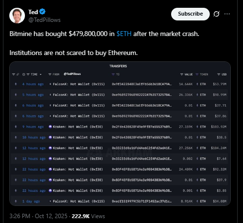 爆料人Ted Pillows称尽管市场波动,"机构显然未回避以太坊"。这笔交易使Bitmine成为2025年ETH最大企业持有者之一。