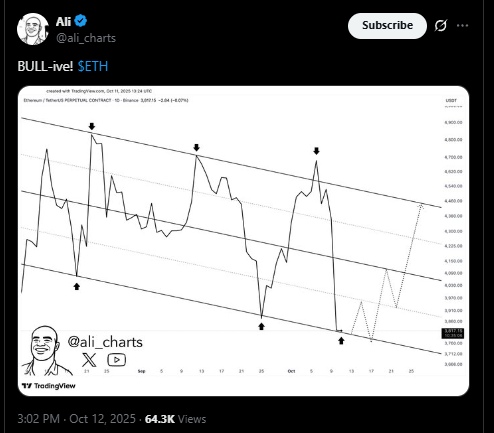 图表显示ETH自8月4,900美元高点到10月3,700美元低点形成下降阻力线。价格多次在4,000美元区域反弹,表明买家在抛压加剧时坚定防守。