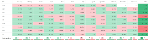 更广泛的Q4趋势同样积极:同期六年实现季度上涨,包括2017年(+115%)、2020年(+86%)和2023年(+33%)的大幅攀升。这些年末反弹通常发生在夏季疲软后,与市场流动性增强和机构回流时段重合。