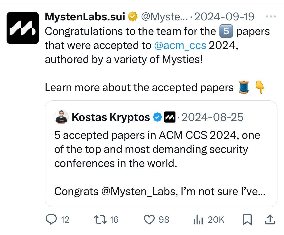 Sui 开发商 Mysten Labs 的学术研究成绩非常优异,最新又有 5 篇文章被计算机行业顶会 ACM CCS 接受。提到工程能力,除了所有人看在眼里的 Sui 公链外,他们还推出了基于 Sui 的去中心化存储协议 Walrus ,并准备接入 SCION 网络标准。此外,Sui 还准备实现无网络情况下通过电波发送交易。