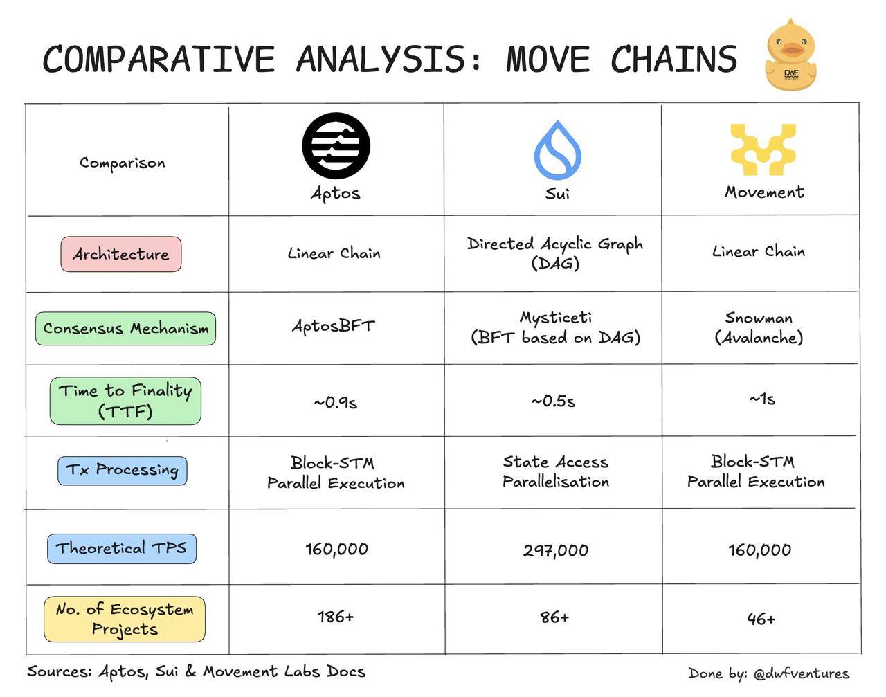 本文主要从非技术角度出发,但也浅谈一下各链间的技术区别。知名做市商研究部门 DWF Ventures 在前段时间发文对这三个链做的「对比分析」中在技术方面列举出了错误的事实。机构尚且如此,可见大家对 Move 公链的技术认知存在着相当大的进步空间。