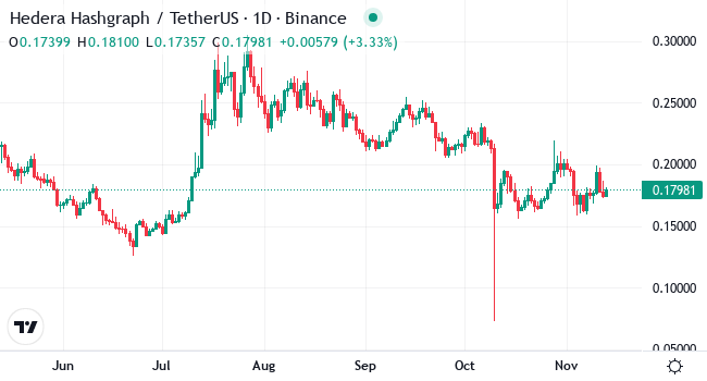 Hedera(HBAR)目前价格在15.8美分至19.5美分之间波动。该币种在13.9美分附近获得支撑,阻力位在21.4美分。如果HBAR突破阻力位,其目标价位可能在25.2美分左右,这意味着潜在涨幅超过25%。近期趋势显示,上周价格小幅上涨略高于2%,但过去一个月下跌了近8%。相对强弱指数(RSI)接近中性,为51.48,表明市场既没有超卖也没有超买。这种稳定性暗示着市场情绪平衡,如果上涨势头增强,则仍有增长空间。