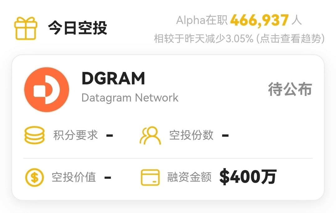 【11月18日空投提醒】🚀 币安Alpha,11月18日空投预告,46万+在职,对比昨天减少3%,继续熬!📅 11月18日(今天)1、Datagram Network ($DGRA) - 中毛30-50U🎁 融资金额:400万美元⬆️🔥 总供应量:100亿枚(固定上限)💵 初始流通量:约21.5%(TGE解锁约21.5亿枚)🕒 上线日期:预计16:00上线,芝麻/BG,18:00上线💎 空投门槛:中高(225-231分)💠 领取方式:积分领取,未提前公布💰 价格预测:TGE初始0.005-0.01美元(FDV 5000-1亿美元),上线后短期0.008-0.02美元(1.5-2025-11-18