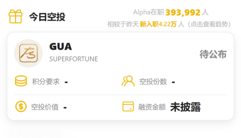 【11月27日空投提醒】🚀 币安Alpha,11月27日空投预告,不是说好的离职吗?怎么又重新入职了!重新回到33万人在职!📅 11月27日(明天)1、SUPERFORTUNE(GUA)-30U大毛💷 融资金额:30万美元⏰ 上线日期:11月27日,16:00📢 空投门槛:中高(221-235分)💰 预计收益:25美金~33美金💠 领取方式:积分领取,未提前公布⚖️ 代币经济学:● 总发行:10亿枚● 初始流通:4500万(4.5%)● alpha空投份额:1000万(1%)(预测)💎 项目介绍:基于AI玄学的区块链金融项目,SuperFortune是一个创新的信息金融项目,旨在2025-11-27