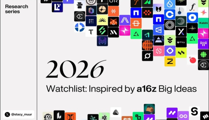 在稳定币规模持续扩张、AI与区块链加速融合的背景下,顶级风投对加密行业的判断正成为重要风向标。a16z(Andreessen Horowitz)近日发布了面向2026年的“大想法”清单,其中加密货币相关内容占据核心位置,涵盖智能代理与AI、稳定币与支付、通证化金融、隐私与安全以及预测市场等多个正在快速升温的赛道。这些观点并非空谈,而是建立在真实应用增长、链上数据变化和监管趋势之上,勾勒出未来一年加密技术可能真正落地并改变现实世界的关键方向。构建未来交易平台只是起点,而非终点如今,除了稳定币和部分核心基础设施之外,几乎所有表现良好的加密货币公司都已经转型为或正在向交易平台方向发展。然而,如果“每2026-01-05
