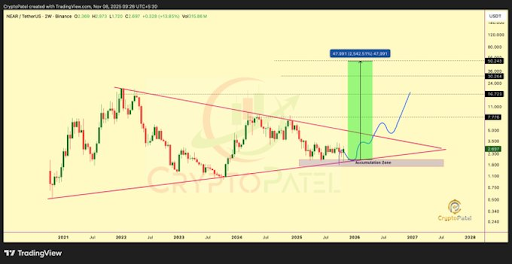 图表分析显示,NEAR Protocol自2022年以来形成一个长期对称三角形形态。这类形态通常出现在长期盘整后,价格在高点下移与低点上移间逐渐收敛。NEAR多次测试阻力与支撑边界,目前已形成明显的收敛三角形结构。