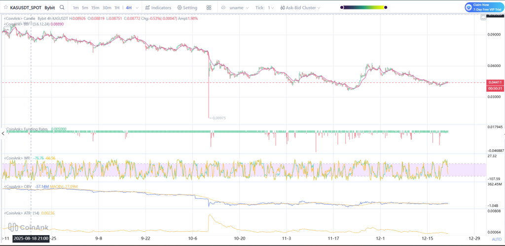 在 4 小时图上,KAS 价格自 9 月初以来一直处于明显的下降通道中。价格持续形成更低的高点,表明卖方仍在控制市场。10 月初的急剧抛售标志着一个局部投降点,此后 KAS 趋于稳定,但未能形成更高的低点。近期的价格走势显示其在 0.043–0.044 美元支撑区上方进行盘整,该区域在过去两周内已多次成功防守。
