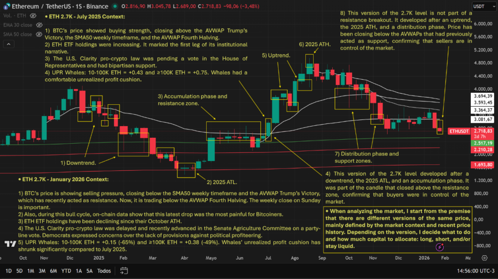 一位分析师对比了2025年7月和2026年1月以太坊在2700美元的情况。该分析师写道,不同市场环境下,相同的价格水平蕴含着“不同的版本”。该分析师以比特币的状况来界定这一转变。