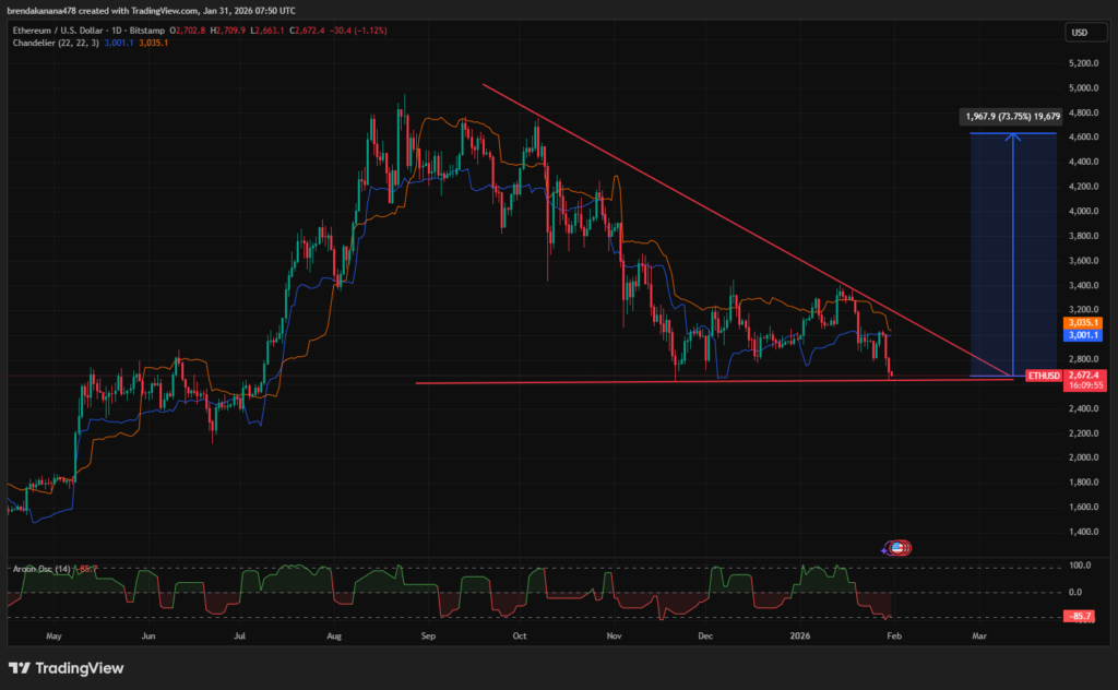 TradingView价格走势亦追踪到自2025年高点以来的更低高点趋势。图表显示价格在一条下降阻力线下滑行。这种格局收紧了围绕2700美元支撑位的波动区间。