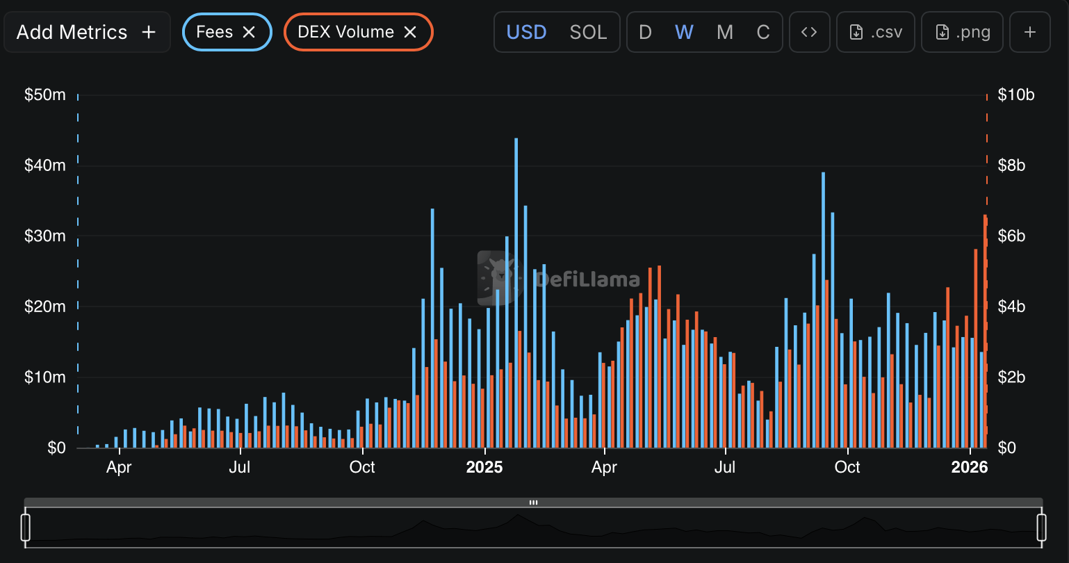 基于Solana的模因币急剧复苏,推动交易量和收入创下新高,Pump.fun在2026年初迎来了有记录以来最强劲的交易活动。1月6日,该平台日去中心化交易量达到历史性的20.3亿美元。这一飙升使Pump.fun成为Solana网络上第二大去中心化交易所,排名仅次于Meteora,并超越了Raydium等成熟交易平台。