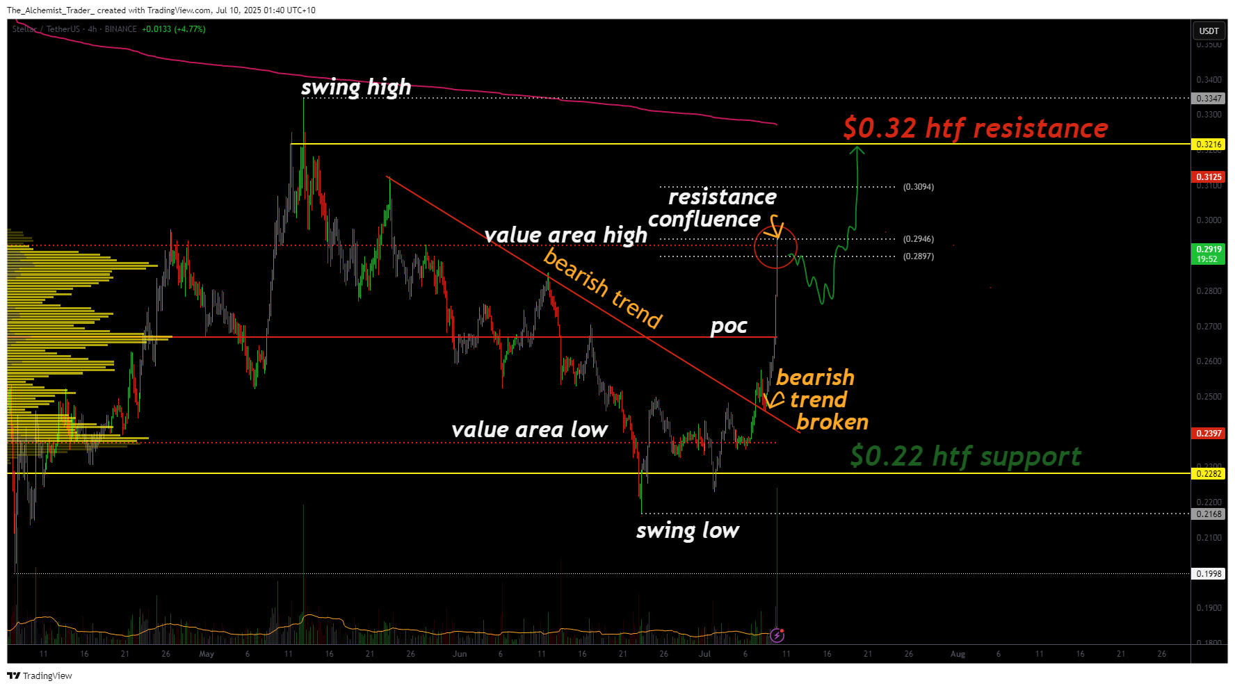 在持续数月的熊市行情后,XLM实现趋势反转。决定性信号是突破压制价格多时的下降趋势线,该突破随后获得趋势线上方多根阳线确认,并伴随强劲的上涨动能。本轮反弹始于0.22美元支撑区——该区域既是价值区间低点,也是历史摆动低点,双重验证了其作为关键反转区域的有效性。