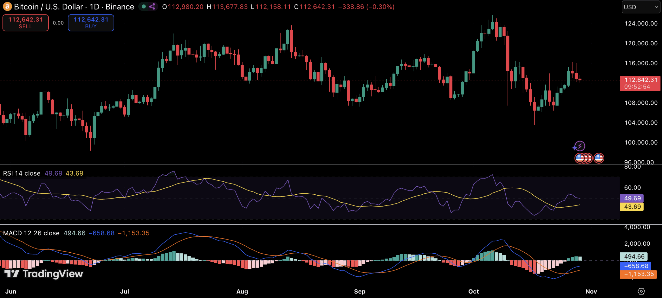 比特币日线图显示多空博弈加剧:RSI指标在50中性区域徘徊,MACD动能持续疲软,既未确认强势反弹,也未预示深度回调。