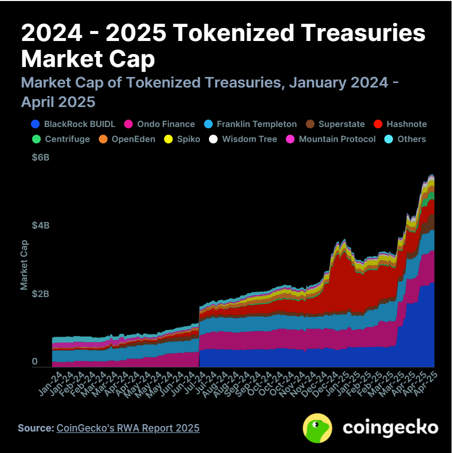 据CoinGecko《2025年RWA报告》,截至2025年4月,代币化国债市值从近乎为零飙升至56亿美元,同比增幅达544%,使其成为同期加密领域增长最快的RWA资产类别。