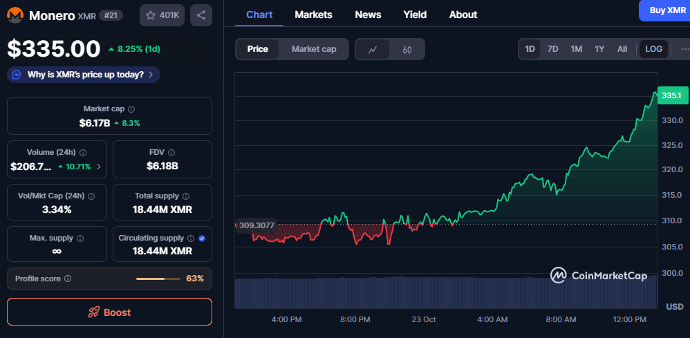 主打隐私安全的门罗币(XMR)周四强势上涨8.25%,24小时内从309.30美元稳步攀升至335.00美元。这一表现凸显市场对隐私型数字资产的持续追捧,反映出投资者信心的显著回升。