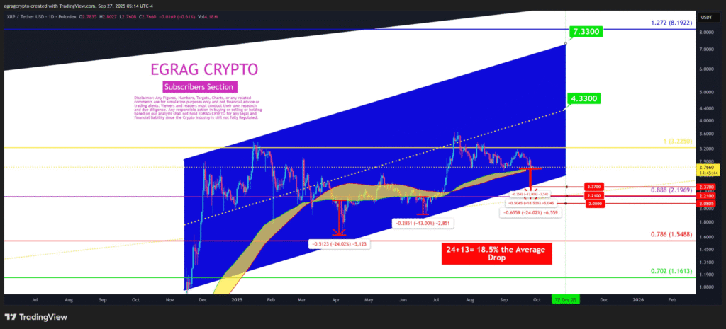 根据历史数据模型显示,XRP可能面临高达24%的跌幅,价格或将回落至2.08美元。若下跌13%,则可能触发2.37美元价位的重大清算事件,而18.5%的平均跌幅将把价格推至2.21美元,这对多头交易者构成显著风险。EGRAG CRYPTO最新交易分析指出,随着XRP逼近关键支撑位,其价格走势正重现2025年4月与6月的波动模式——前者曾出现24%的深跌,后者则录得13%的跌幅,这些历史数据正为当前潜在回调提供预测依据。