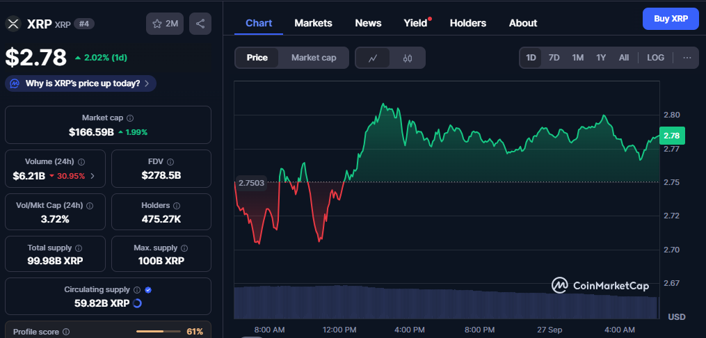截至发稿时,XRP现报2.78美元,24小时涨幅2.02%,价格虽呈现小幅震荡但整体维持上行趋势。