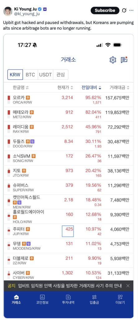 (Ki Young Ju)在交易所因检测到价值约3600万美元的异常交易暂停提现服务后,Ju通过社交平台指出:虽然Upbit遭遇安全事件并暂停提现,但由于套利机器人停止运行,韩国投资者反而开始推高山寨币价格。